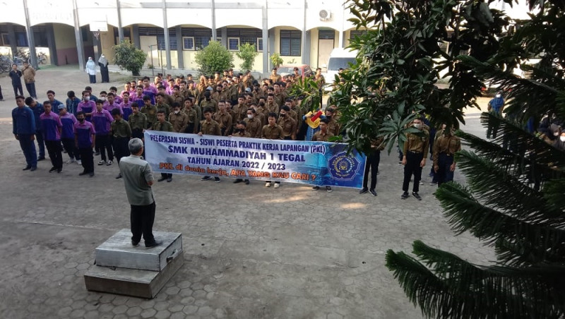TEGAL - 244 siswa Kelas XII SMK Muhammadiyah 1 (Mutu) Kota Tegal resmi dilepas untuk mengikuti Praktik Kerja Lapangan (PKL) melalui acara penglepasan yang digelar di Halaman SMK Mutu, Jumat (29/7). Mereka akan diberangkatkan ke perusahaan-perusahaan di Jabodetabek, Tegal, Brebes, dan Slawi untuk menjalani PKL selama tiga bulan.