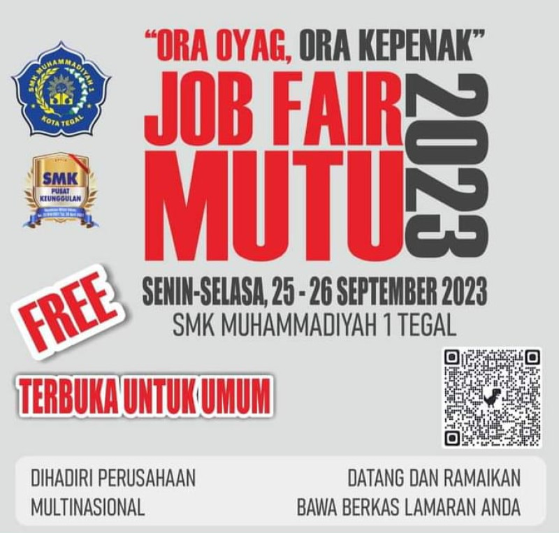 Menjelang penghujung akhir tahun 2023 SMK Mutu Kota Tegal mengadakan kegiatan yg sangat bermanfaat dan sangat di cari oleh para pencari kerja karena di jaman sekarang ini di mana lapangan pekerjaan terasa susah di dapat apalagi yang sesuai dg kualifikasi pendidikan yg di miliki. SMK Mutu hadir memberikan solusi dengan menyedikan kegiatan JOB FAIR selama dua hari bertempat di halaman SMK Mutu dg mengudang beberapa perusahaan lokal dan dari kegiatan ini banyak menyerap tenaga kerja apalagi yg sesuai jurusan di SMK Mutu Kota Tegal.