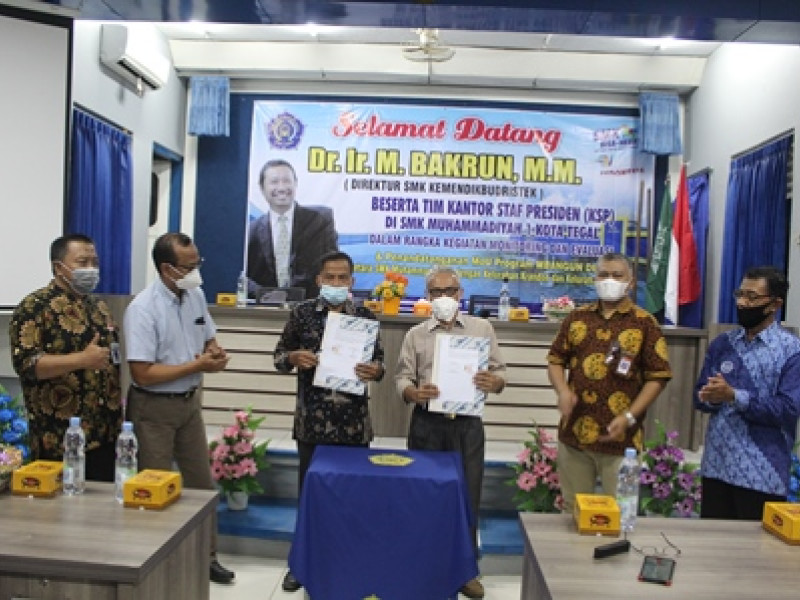 TEGAL - Tim Kantor Staf Presiden Republik Indonesia bagian Tenaga Ahli Utama Bidang Pembangunan Manusia hadir di SMK Muhammadiyah 1 Kota Tegal jawa Tengah pada 26 Mei 2021 . didampingi Direktur SMK KEMERISTEKDIKTI Program kunjungan tersebut dalam rangka kegiatan monitoring dan...